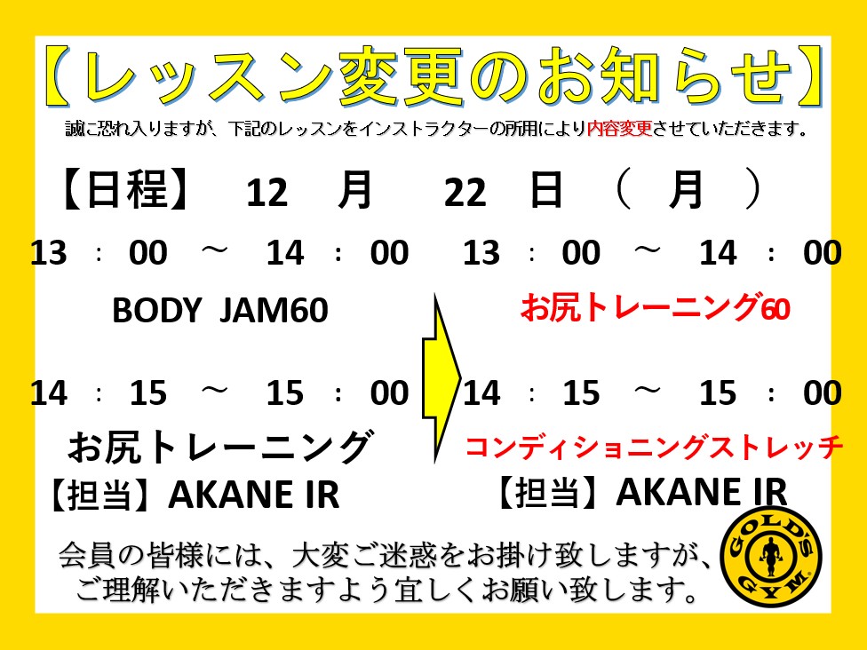 12月01日(月)レッスン休講のお知らせ(BODYJAM45、お尻トレーニング)