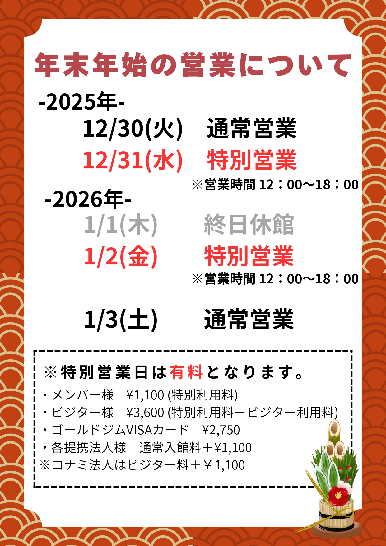 2026年1月度一部店舗休館日変更のご案内|全店舗